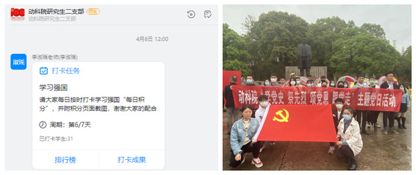 緊盯“新”字,活用形式掀熱潮。活用線上學習平臺,依托“學習強國”開展學習教育,學院學生支部借助“釘釘”建立積分打卡制度,隨時查看黨員每日學習情況,促進對黨史內容的學習掌握;活用紅色資源,積極開展紅色活動,4月2日,學生支部瞻仰方志敏烈士陵園,開展“學黨史、祭先烈、頌黨恩、跟黨走”黨史學習教育,在歷史與現實相貫通、讓紅色基因融入血脈,讓英烈精神薪火相傳;活用新媒體,統籌學院團委微信公眾號、新浪微博等“兩微一端”,開設“感黨恩 跟黨走——黨史知識大家答”、“黨史百年天天讀”等專題專欄,以“接力棒”的形式講好紅色故事,重走紅色征程,讓黨史故事“直達”師生手中。