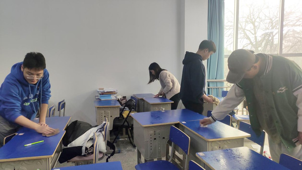 在活動過程中,同志們熱情洋溢地進行清掃活動,對桌子認真整理、清潔,對垃圾紙屑進行處理,將地面清掃干凈,擺正自習室座位,每位同志都積極參與到打掃衛生的活動中,高效完成打掃工作,取得較滿意的效果,讓自習室瞬間干凈整潔。展現了大學生陽光向上,精神飽滿的良好狀態。