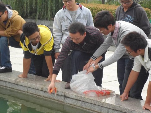9月28日下午,我院養魚興趣小組全體成員在保衛處宮科長及團委書記管國泉的帶領下一同來到我校“生命雕塑”旁的水池進行觀賞魚的放養活動。活動中養魚興趣小組組員先給水池進行專業的水質檢測、消毒等前期工作,然后與管國泉書記一起進行放魚。在此次活動中,宮科長高度贊揚我校動物科學技術學院的專業特色,和養魚興趣小組為建設美麗校園而做出的貢獻,并對飼養觀賞魚的日后工作作了細致的指導。同時,管國泉書記對養魚興趣小組的發展表示了殷切的關心和支持,并給予小組工作充分的肯定。