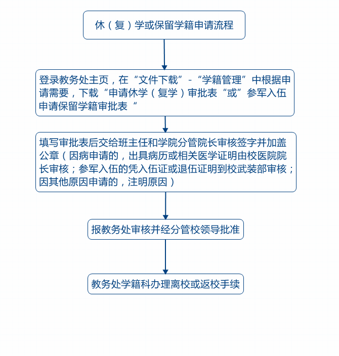 鏈接: 申請(qǐng)復(fù)學(xué)流程、申請(qǐng)休學(xué)流程、申請(qǐng)保留學(xué)籍流程