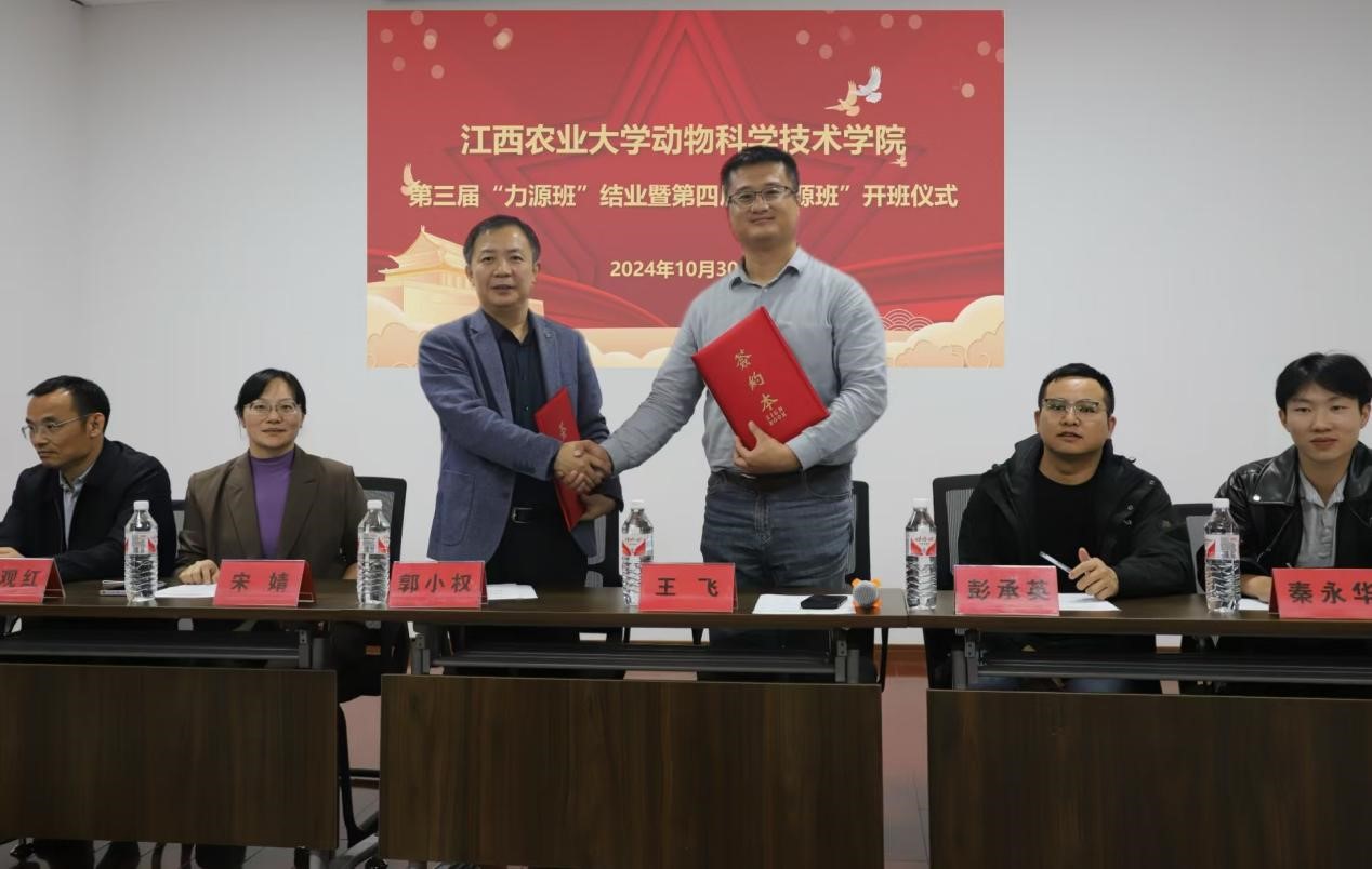 10月30日晚, 我院于院辦201報告廳舉行第三屆“力源班”結業暨第四屆“力源班”開班儀式。院長郭小權、院黨委副書記宋婧、現代畜牧產業學院副院長黎觀紅、輔導員蔣家威、力源集團豬事業部江西區域總監王飛一行出席。第三屆、第四屆“力源班”全體成員參加儀式。