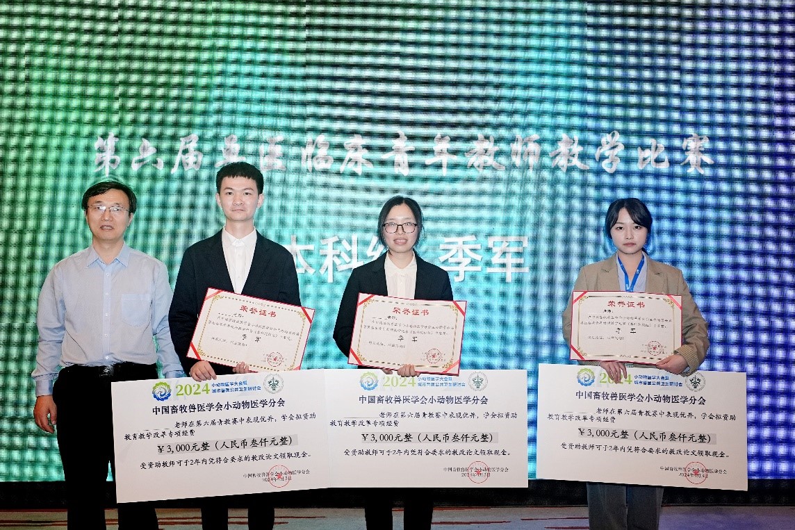 為了全面貫徹黨的教育方針,落實(shí)立德樹人根本任務(wù),鼓勵(lì)各農(nóng)業(yè)院校臨床獸醫(yī)專業(yè)青年教師鉆研教學(xué)、提高教學(xué)水平和教學(xué)質(zhì)量,鼓勵(lì)青年獸醫(yī)師潛心臨床、相互切磋,搭建青年教師與獸醫(yī)師教學(xué)技能和教學(xué)經(jīng)驗(yàn)的交流平臺(tái)。中國(guó)畜牧獸醫(yī)學(xué)會(huì)小動(dòng)物醫(yī)學(xué)分會(huì)舉辦第六屆全國(guó)獸醫(yī)臨床青年教師教學(xué)比賽,我院動(dòng)物醫(yī)學(xué)專業(yè)教師楊帆博士赴成都參加比賽,斬獲了大賽季軍的好成績(jī)。