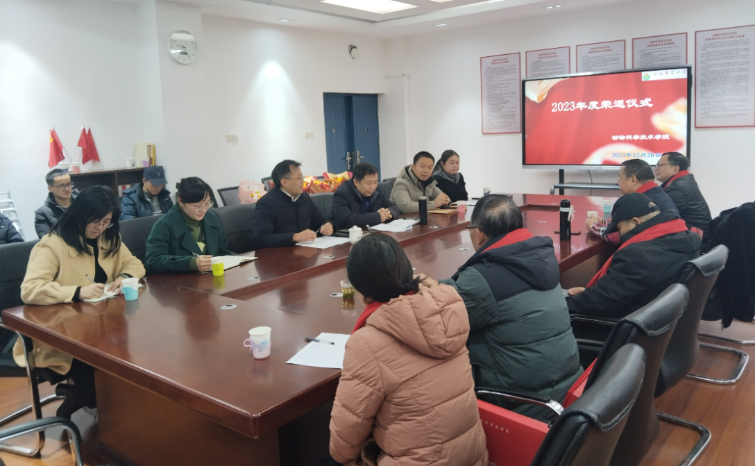 2023年12月26日上午,動物科學與技術學院為今年光榮退休的舒鄧群、王萍、蘭旅濤、吳登堃和趙燈山五位老師舉行了榮退儀式。院黨委書記王義華,院長郭小權,黨委副書記宋婧,副院長吳小波、彭墨,院工會主席李琳以及各教研室代表出席儀式。