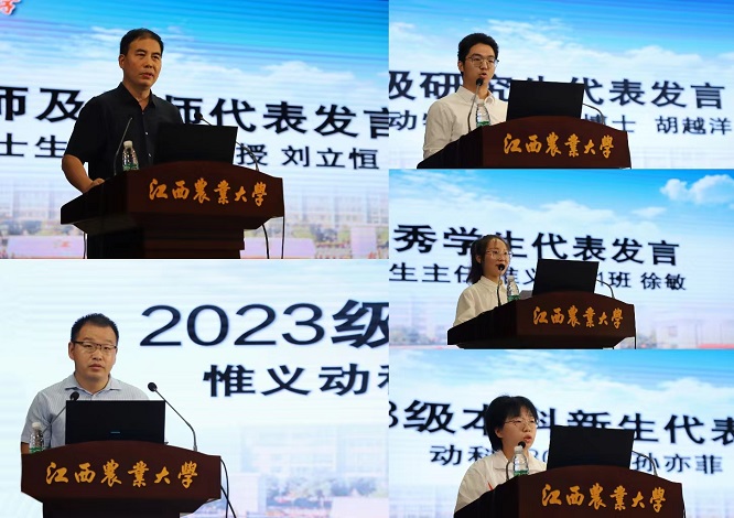 伴隨著莊重的國歌,開學典禮正式開始。郭小權代表學院向全體2023級新生表示歡迎并發表致辭,他寄語同學們做“善良有愛、自信肯干、勇于拼搏”的時代新人,書寫無愧時代、社會的青春華章。教師代表劉立恒和班主任代表陳彪先后上臺發言,他們將多年的教育教學和學生指導經驗傾囊相授,愿同學們做好學習規劃,共同譜寫屬于動科人的華彩篇章。2023級本科生代表孫亦菲、博士研究生代表胡越洋、優秀老生代表徐敏相繼發言,他們分別分享了自己入學以來的收獲和感悟,號召同學們矢志不渝擔責任,篤行不殆向未來。王義華作總結講話,他從“做人、做事、做學問”三個角度出發,希望全院師生要凝心聚力、攜手奮進,立足新起點、新征程,以新擔當、新作為推動學院高質量發展。