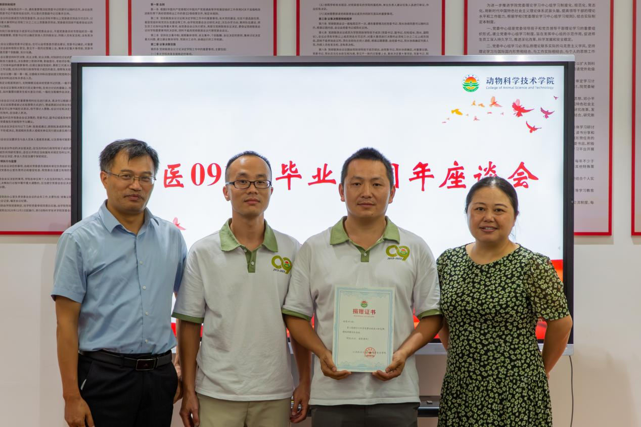 接下來舉行校友捐贈儀式,動醫091班班長高靜波和團支書鐘圣偉代表諸位校友為母院捐贈,王義華為校友代表發放捐贈證書。