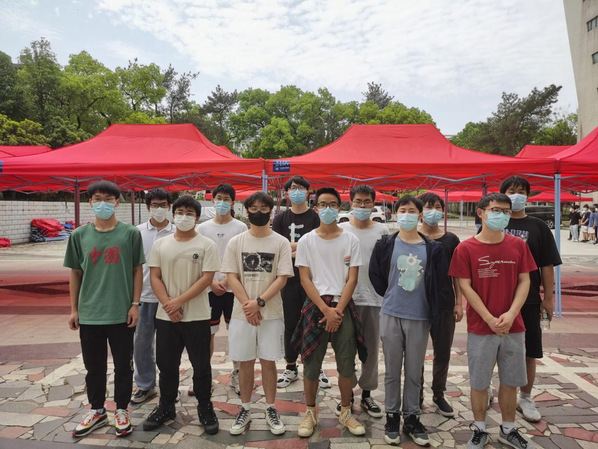 “我們先把這幾個帳篷放到旁邊”“那個角去一個人,大家一起把帳篷支起來。”在接到任務后,惟義動科2101班付坤同學第一時間報名,與志愿者們一起協助校團委搭建了二十余頂遮陽帳篷,解決了我校核酸檢測場地的問題。