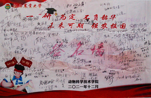 會議最后考研學(xué)子在就業(yè)升學(xué)黨小組精心準(zhǔn)備的簽名墻上鄭重寫下名字,作出承諾,學(xué)院老師們?yōu)榭佳袑W(xué)子送上禮物:愿有前程可奔赴、亦有青春可回首。考研學(xué)子紛紛表示,感謝學(xué)院的精心準(zhǔn)備、加油鼓氣,在動科院的四年里學(xué)有所成,考研也一定能取得佳績、靜待佳音。