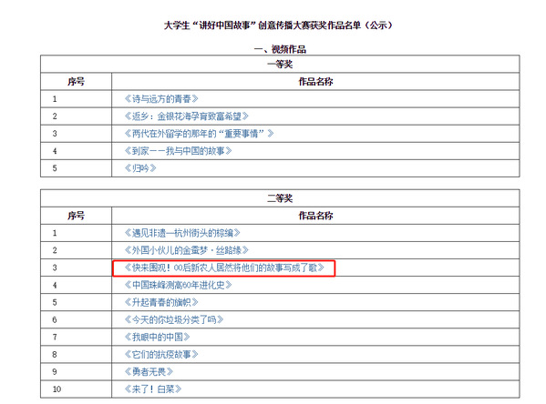 由國務院新聞辦指導,中國外文局主辦的2020“講好中國故事”創(chuàng)意傳播大賽的分類賽事大學生“講好中國故事”創(chuàng)意傳播大賽(下稱“大講賽”)評審結果公布。我院選送作品《快來圍觀!00后新農(nóng)人居然將他們的故事寫成了歌》榮獲大講賽二等獎。