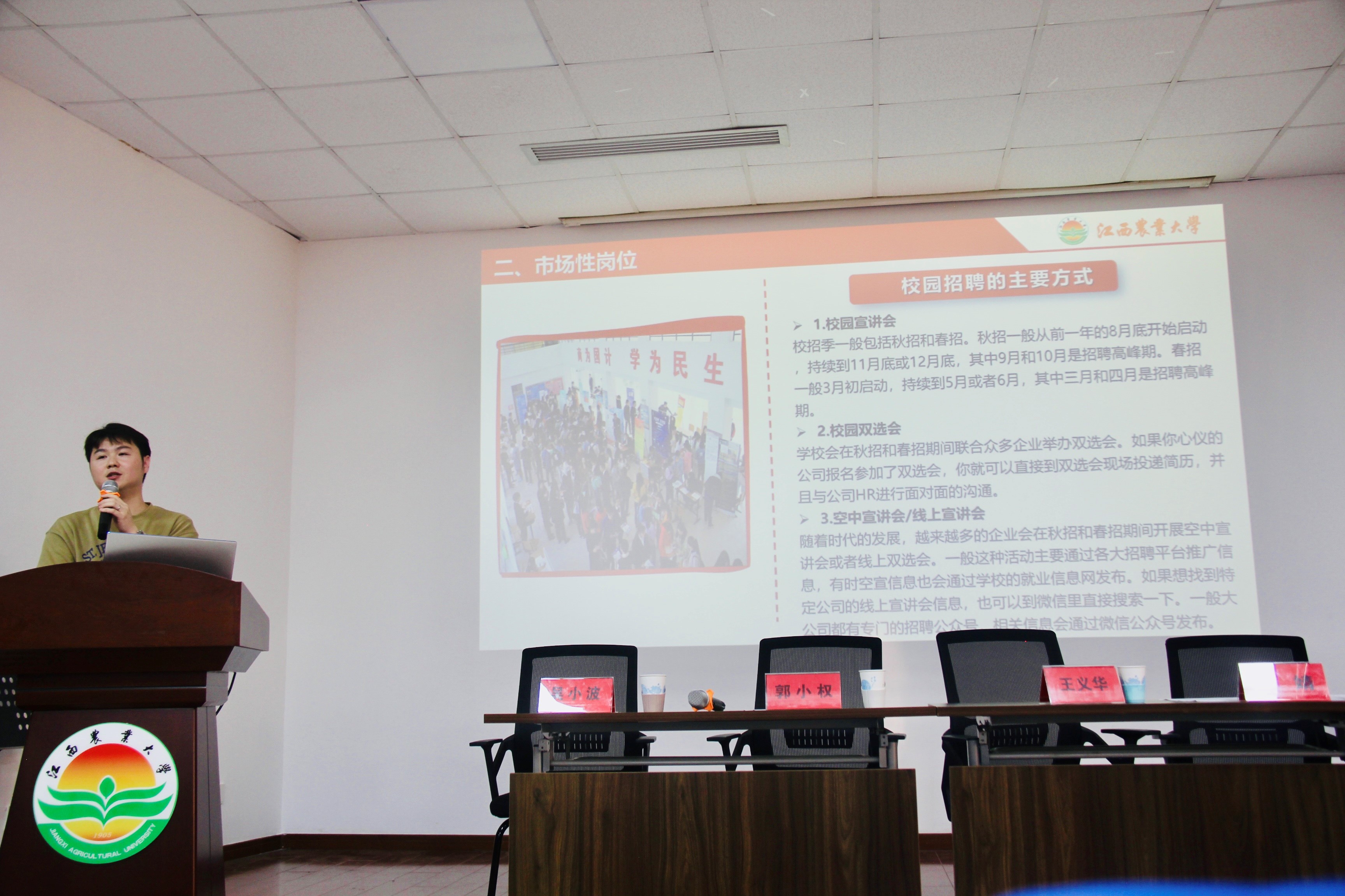 其次,強(qiáng)調(diào)在當(dāng)前就業(yè)形勢(shì)下,了解并把握春、秋季校園招聘的重要性。介紹了企業(yè)的招聘流程、崗位需求、薪酬福利、晉升機(jī)制以及針對(duì)應(yīng)屆畢業(yè)生的專項(xiàng)培養(yǎng)計(jì)劃等內(nèi)容,并就畢業(yè)生關(guān)心的三方協(xié)議、應(yīng)屆畢業(yè)生身份等問題進(jìn)行解讀。