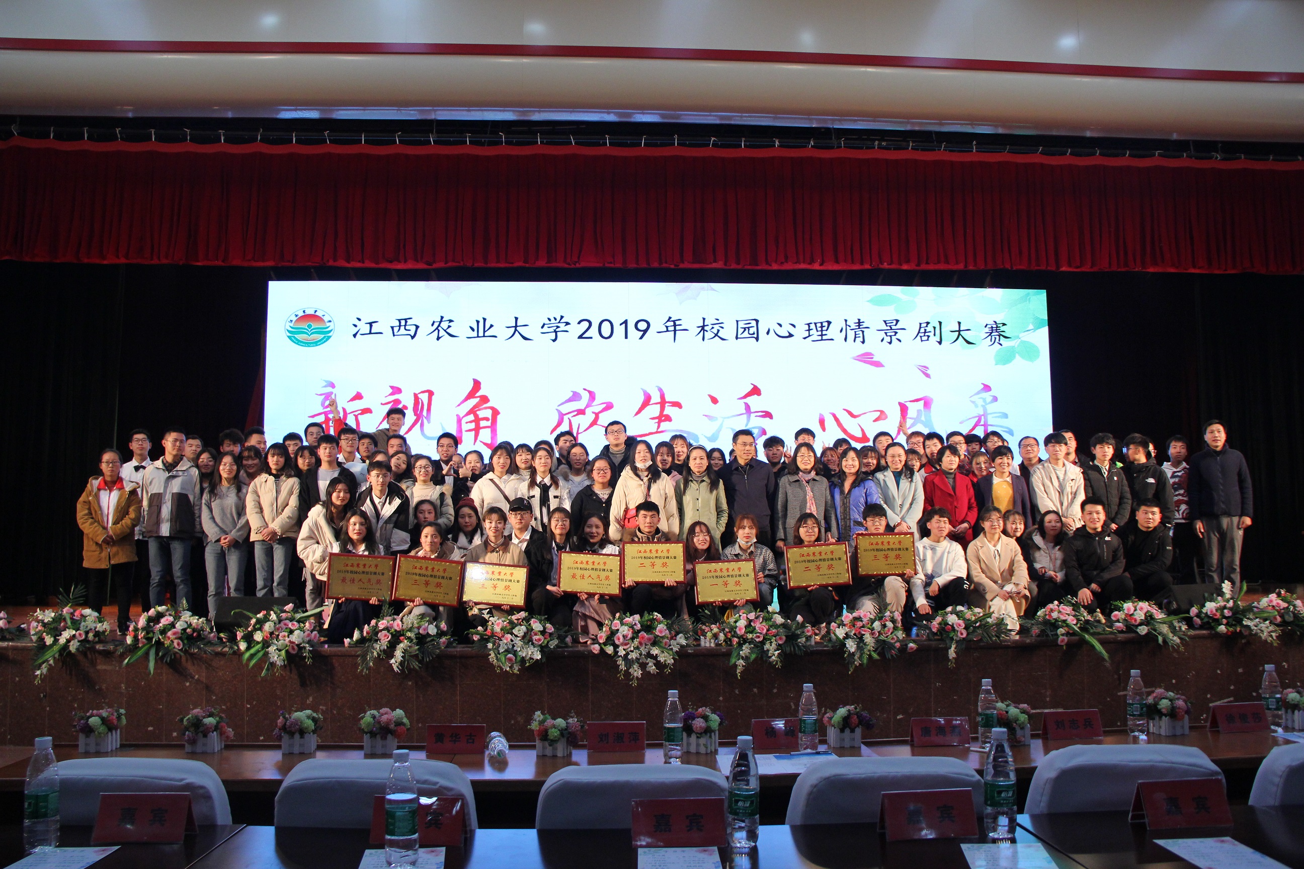 為宣傳普及心理健康知識,進一步營造健康向上的校園心理文化,12月10日晚,由我校學生工作處主辦、我院承辦的2019年校園心理情景劇大賽于逸夫報告廳圓滿落幕。江西財經大學心理咨詢中心主任唐海燕、江西科技師范大學心理咨詢中心主任劉淑萍、東華理工大學心理咨詢中心主任劉俊莎、我校黨委委員宣傳部部長楊峰、江西農業大學附屬中學黨支部書記黃華古、我校教學質量評估與監管中心主任劉志兵、我校學工處副處長心理咨詢中心主任李海峰擔任此次大賽的評委,各學院黨委副書記及輔導員老師出席活動,七百多名同學到場觀看。