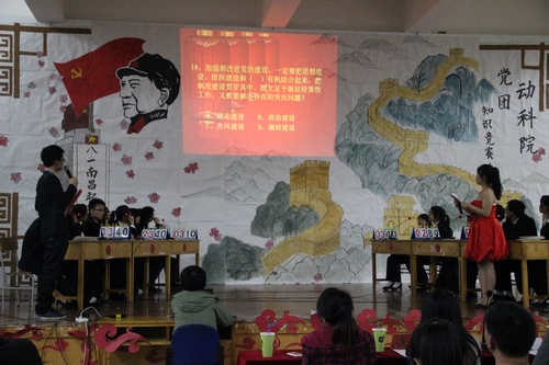 迎著兩會(huì)的春風(fēng),4月19日晚,我院團(tuán)委第四屆黨團(tuán)知識(shí)競(jìng)賽決賽在大學(xué)生活動(dòng)中心501圓滿落幕。蒞臨本場(chǎng)的嘉賓有動(dòng)科院黨委副書(shū)記楊秀江、生泰爾集團(tuán)副總裁姜殿國(guó)、團(tuán)委書(shū)記管?chē)?guó)泉、學(xué)工辦老師楊靜,校學(xué)生會(huì)主席以及各兄弟院系學(xué)生團(tuán)委副書(shū)記擔(dān)任此次活動(dòng)的評(píng)委。