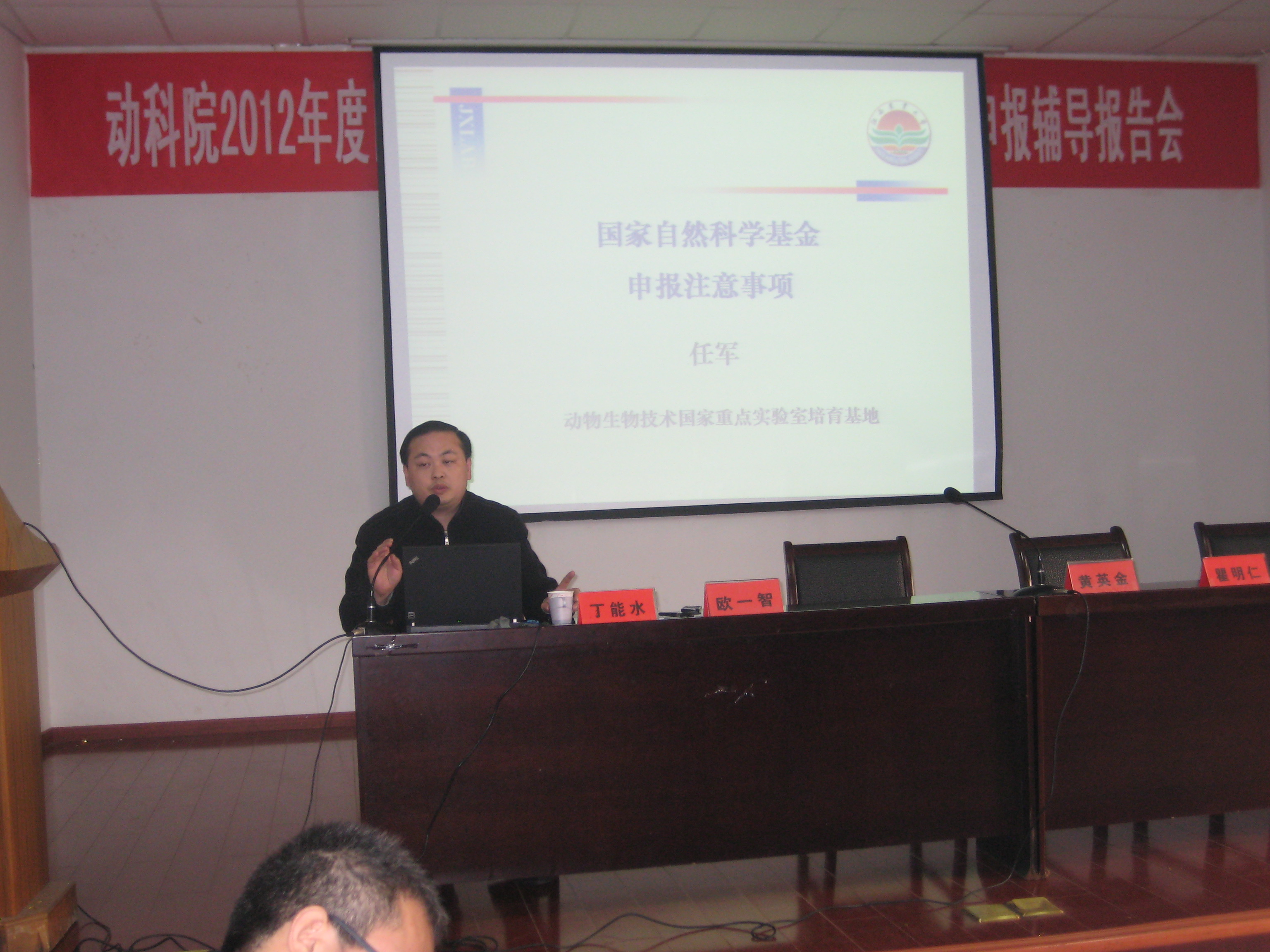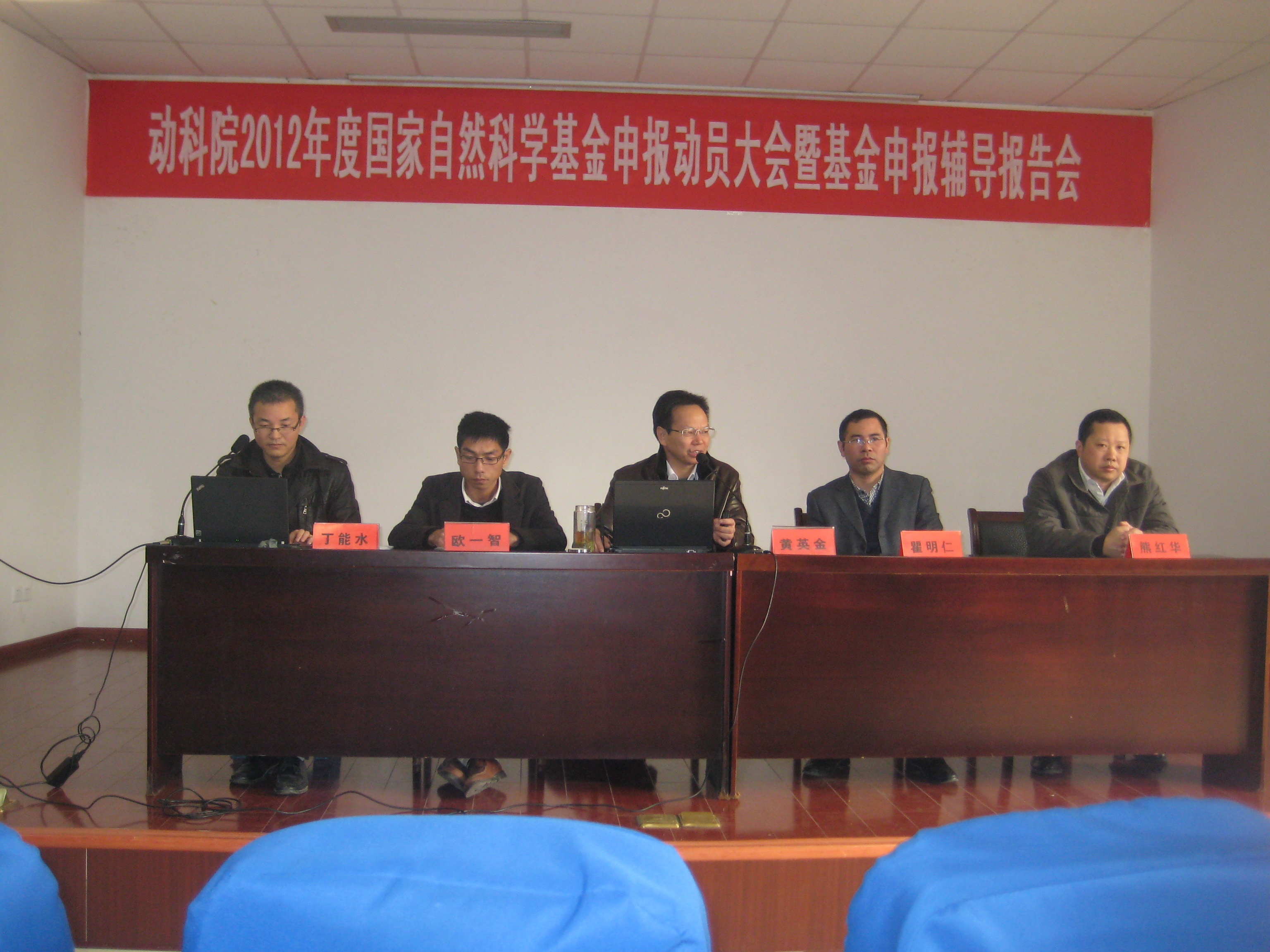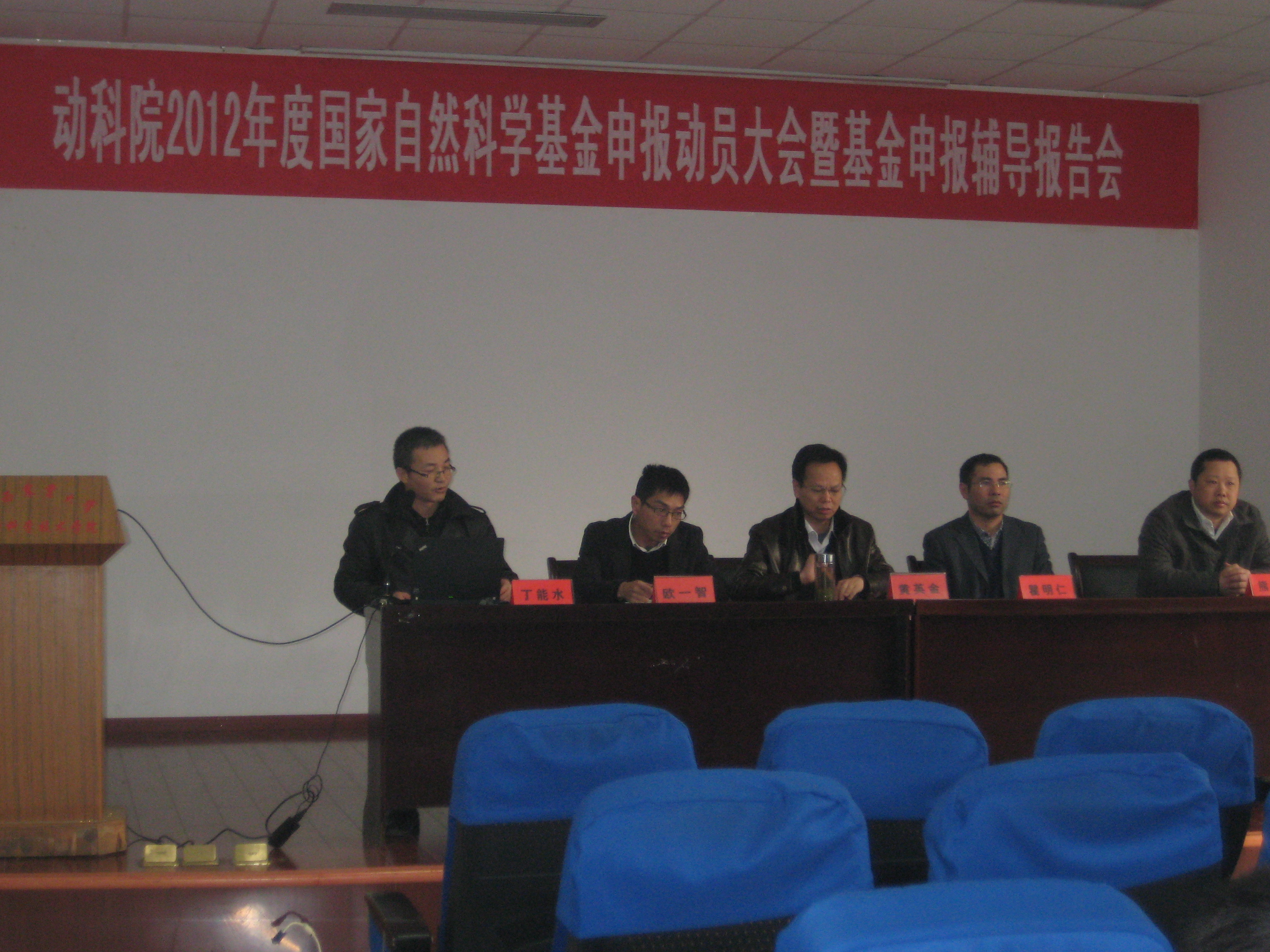 2011年12月6日,在動(dòng)科院報(bào)告廳隆重舉行了2012年度國(guó)家自然科學(xué)基金申報(bào)動(dòng)員大會(huì)與基金申報(bào)輔導(dǎo)報(bào)告會(huì),出席會(huì)議的有校科技處處長(zhǎng)黃英金、??萍继帤W一智、動(dòng)科院黨委書記熊紅華、院長(zhǎng)瞿明仁、副院長(zhǎng)陸偉、游金明,會(huì)議由丁能水副院長(zhǎng)主持,動(dòng)科院全體老師積極參加。