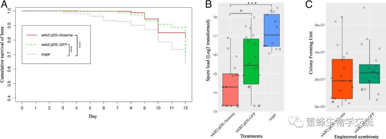 微孢子是對蜜蜂危害最大的體內寄生蟲,可直接導致蜂群瓦解。煙曲霉素曾是治療微孢子感染的主要藥物,但由于長期使用,微孢子已經對其產生抗性。Snodgrassella alvi是貼靠在蜜蜂腸道壁的共生菌,對蜜蜂生長發育和免疫應答起重要調節作用。該論文運用合成生物學,將微孢子關鍵基因部分DNA導入該共生菌。在共生菌增殖過程中,釋放出大量dsRNA,抑制微孢子繁殖,并延長蜜蜂壽命。改造后的共生菌在蜜蜂個體間快速傳播,可形成群體免疫該研究成果解決了外緣dsRNA制備價格昂貴且不穩定的難題,為蜜蜂病蟲害防治提供新思路。