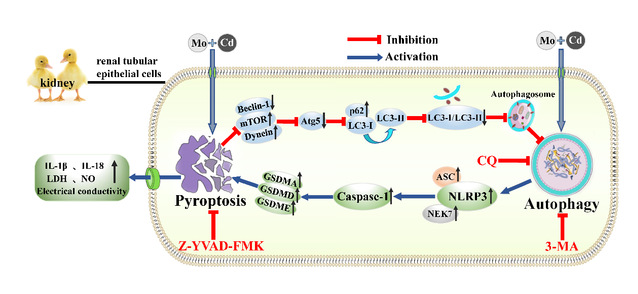 在國家自然科學基金項目的資助下,我院臨床獸醫學團隊在重金屬鉬鎘聯合致鴨腎毒性機制研究方面又取得新進展,研究成果以“New insights into crosstalk between pyroptosis and autophagy co-induced by molybdenum and cadmium in duck renal tubular epithelial cells”為題,于5月17日在《Journal of Hazardous Materials》在線發表,該成果首次從細胞焦亡與自噬之間的關系方面揭示了鉬鎘聯合致鴨腎毒性的細胞和分子機制。江西農業大學為第一作者單位,我校張彩英教授和臨床獸醫學碩士研究生胡志勝為論文共同第一作者,胡國良教授為論文通訊作者。