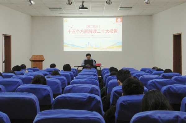 張高亮緊扣宣講主題,聯系實際,從大會盛況,過去5年的工作和新時代10年的偉大變革,馬克思主義中國化時代化、中國式現代化、全面建設社會主義現代化國家的目標任務,深刻領會把握黨的二十大的精神實質等方面,進行了系統宣講和闡釋。張高亮指出,學習宣傳貫徹黨的二十大精神,是當前和今后一個時期全校上下的首要政治任務,全體師生要在全面學習上下功夫、在全面把握上下功夫、在全面落實上下功夫,尤其注重四個“學”:一是要帶著政治覺悟反復學,學出理想信念來;二是要對照系列講話結合學,學出真情實感來;三是要立足本職崗位研究學,學出本事本領來;四是要把握目標重點學,學出職責使命來。