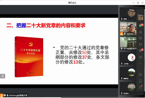 為深入學習和領會黨的二十大精神,貫徹黨的二十大精神的豐富內涵、精神實質和實踐要求,11月29日,水產教職工黨支部采用線上線下相結合的模式開展“學習黨的二十大報告和新黨章”主題黨日活動。