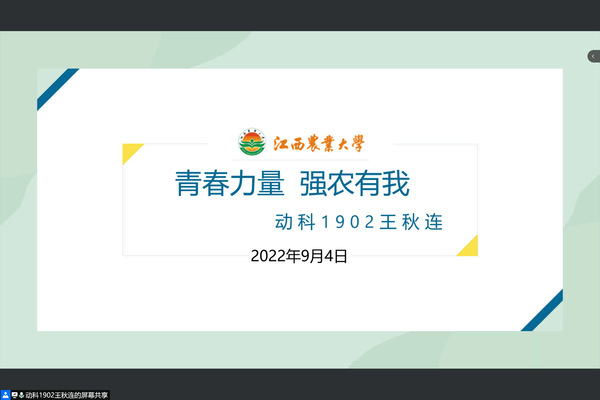 青春孕育無限希望,青年創(chuàng)造美好明天。9月4日晚,我院“青春講堂”在云端開講,主講人動科1902班王秋連以“青春力量,強(qiáng)農(nóng)有我”為題給2022級全體新生上了一堂生動的朋輩思政課。