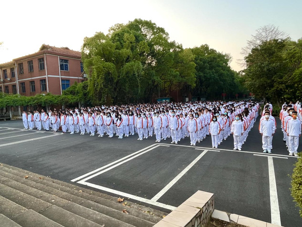 惟義樓的國旗臺前,迎著晨曦燦爛的朝陽,各班同學在國旗臺前整齊列隊、秩序井然。升旗儀式正式開始,英姿颯爽的國旗護衛隊護送著莊嚴鮮艷的五星紅旗入場。伴隨著《義勇軍進行曲》的奏響,五星紅旗冉冉升起、迎風飄揚。同學們向國旗行注目禮,用嘹亮的歌聲表達對祖國的無限熱愛與崇高敬意。