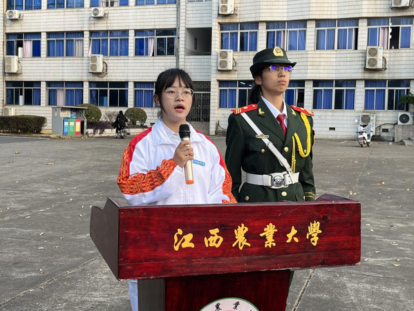 惟義動科2201班胡佳榮在國旗下發言。她表示,一代人青年人有一代青年人的使命,一代青年人有一代青年人的作為,站在新時代節點,江農學子們要牢牢接住時代接力棒,把個人的學習奮斗匯入國家發展的洪流,為祖國的偉大事業賡續傳承、接力奮斗,乘新時代的春風,在祖國的萬里長空放飛青春夢想。