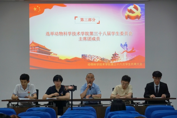 緊接著,學生會主席蔣家威宣讀第三十七屆學生會工作報告,各代表依次宣讀候選人簡介、選舉辦法、選舉程序及監票人等相關事宜,選舉產生了動物科學技術學院第三十八屆學生委員會委員及學生會主席團。
