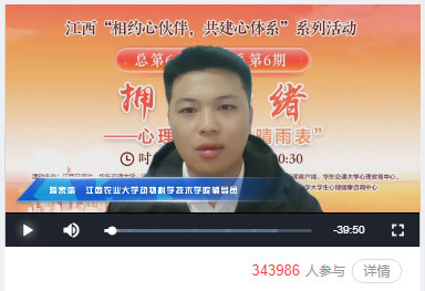 學院實施“本科生導師制”,為每一位本科生配備導師,做好思想引領、學業(yè)指導、學術科研的同時加強對學生人文關懷和心理疏導。專業(yè)教師充分發(fā)揮學科優(yōu)勢,積極參與心理健康教育研究與實踐指導,將科研成果轉化為教學資源,將科學研究中遇到困難到堅定方向的心路歷程等巧妙融入專業(yè)課程教學之中,助力學生構建系統(tǒng)全面的知識體系與科學思維方式,從專業(yè)學習角度引導學生樹立正確的心理健康觀念。輔導員作為學生成長道路上的引路人,通過日常談心談話、定期心理健康篩查等方式,密切關注學生心理變化,及時察覺并妥善處理心理問題。其中,輔導站一名輔導員參加了由江西日報社、華東交通大學、江西省學校心理健康教育中心聯(lián)合主辦的“相約心伙伴,共建心體系”全省直播訪談活動,吸引了三十余萬人次觀看,進一步提升了學院心理健康教育的知名度和影響力。
