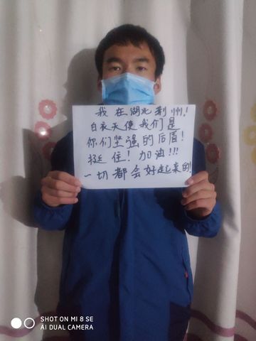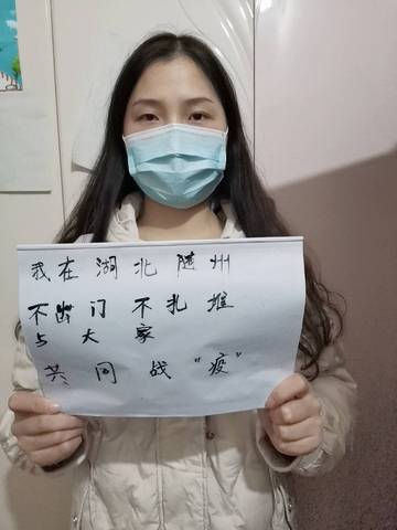 我是黃詩楊,我在湖北隨州,一切安好,我向大家報平安!在這場突發(fā)的疫情中,身處湖北的我們理性面對,做好自身防護:戴口罩,勤洗手,多通風,聽從鐘南山院士的指揮,不出門,不聚集,不給一線人員增加負擔。在居家防疫的這段時間,我作為學生也在積極學習,預習本學期課程,做好線上學習的準備。學校學院也對我的情況密切關注,老師也經(jīng)常致電詢問我的身體及心理狀況,我也積極配合學校工作。我相信在所有人的共同努力下,我們一定可以打贏這場沒有硝煙的戰(zhàn)爭!