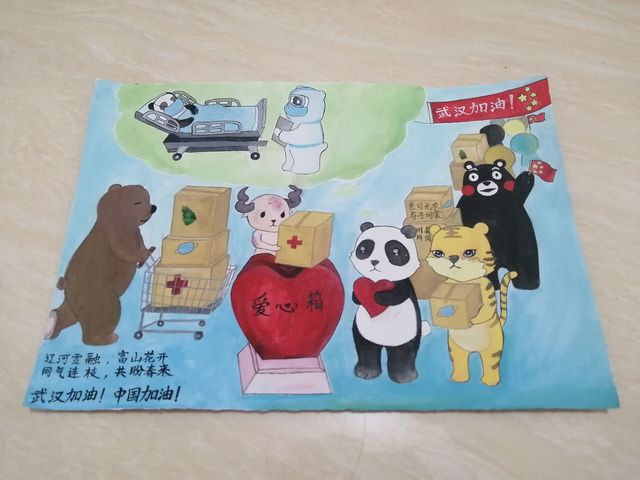 棕熊、老虎、熊本熊、羊四只動物不遠千里為熊貓送來了暖心的資助,惹得熊貓熱淚盈眶。動科1903班的馬龍鈺同學向我們道來了其背后的寓意:“我用不同的動物表示各方無私的資助,一方有難、八方支援,溫暖了我們。中國在全力搶救武漢。武漢勝則湖北勝,湖北勝則中國勝!讓我們一起加油吧!”